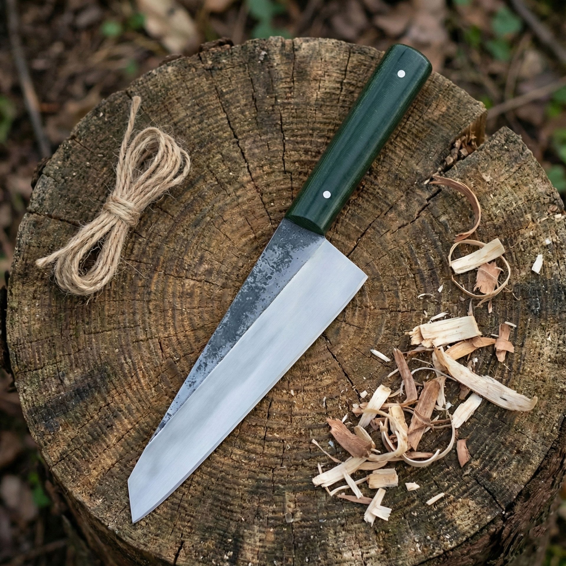 Almazan Hand Forged Carbon Steel Chef Knife With Micarta Wood Handle By Almazan Knife has enhanced slicing ability making it particularly popular with both professional chefs and home cooks. The Chef Knife design allows ease of cutting and better food release than other knives. The Knife Edge determines the sharpness of the blade and is made from high-carbon steel. The chef knife features a full-tang carbon steel blade that is durable and well-balanced. This knife is made of high quality, a good choice for slicing, cutting, chopping, or preparing meat, fish, vegetables, and fruit. You also want to consider how it feels in your hand. The handle provides a solid and comfortable grip.