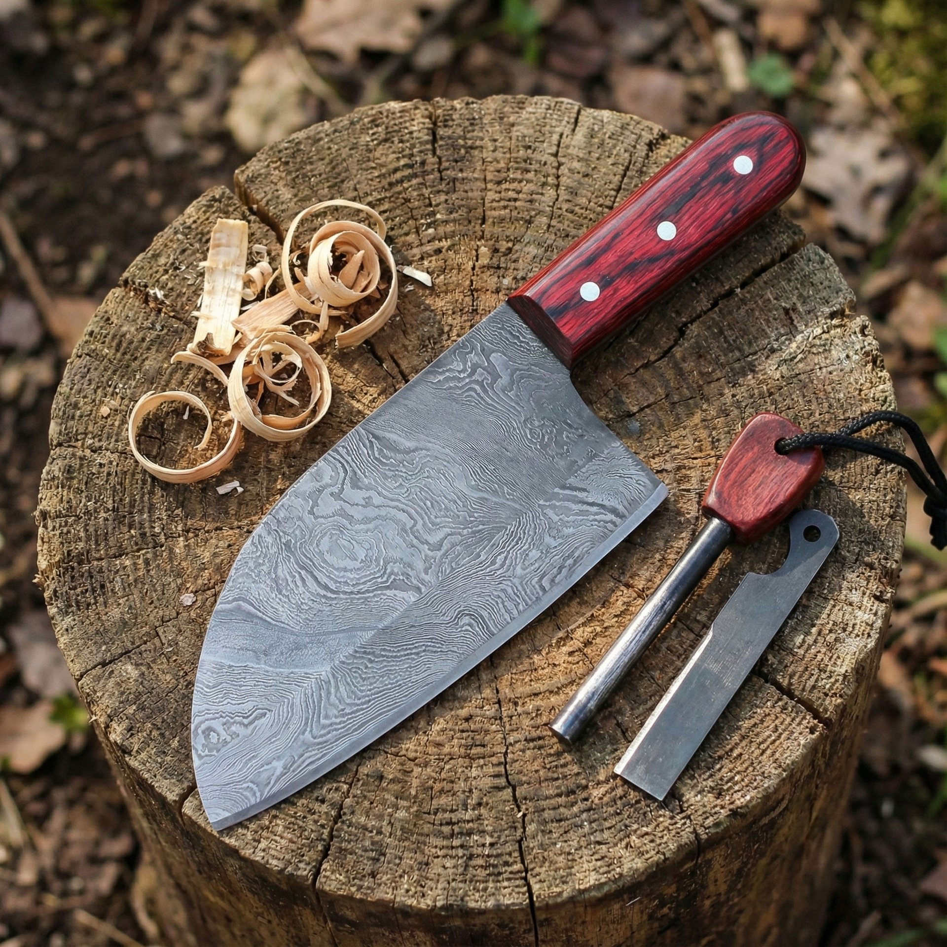 Elevate your cutting experience with a stunning Damascus steel blade. This unique metal known for it's beautiful waterfall patterns, is crafted from expertly layered steels. It boasts exceptional strength, sharpness, and resilience. ensuring your knife stays a reliable companion for years to come! A top-grade wood handle for extra strength and durability tastefully adorned with a 3 classic metal rivets. Ergonomically designed rounded handle ensures a secure and comfortable grip!